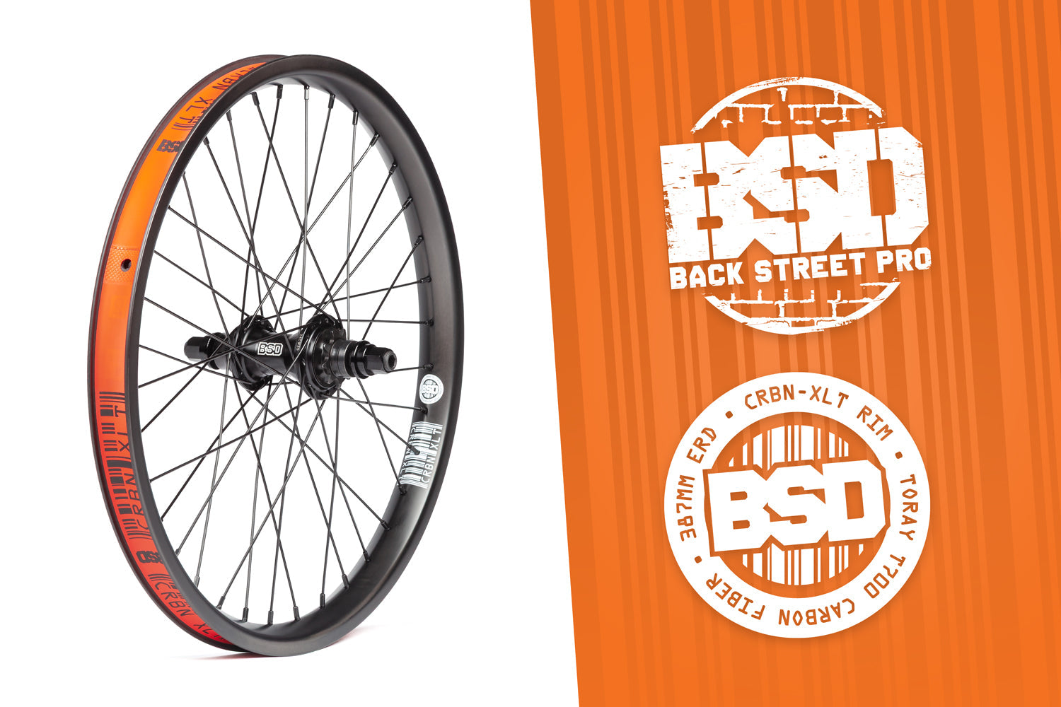 The BSD CRBN-XLT Back Street Pro is a top end premium complete rear cassette wheel built for riders who want the very best in performance and durability. It combines the proven Back Street Pro cassette hub with the new ultra-light CRBN-XLT carbon fibre rim for an unparalleled fast and responsive ride.